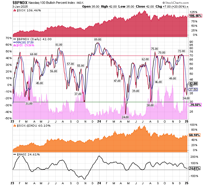 After the market closes updated data on the NASDAQ 100 and Point and Figure Data for the NDX. Also Point and Figure Data on the 30 SOX Components. An explanation of PnF Charting can be found here: