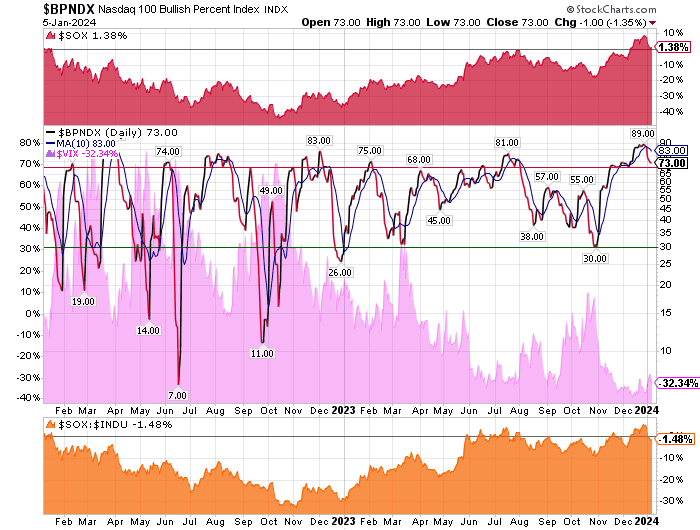 After the market closes updated data on the NASDAQ 100 and Point and Figure Data for the NDX. Also Point and Figure Data on the 30 SOX Components. An explanation of PnF Charting can be found here: