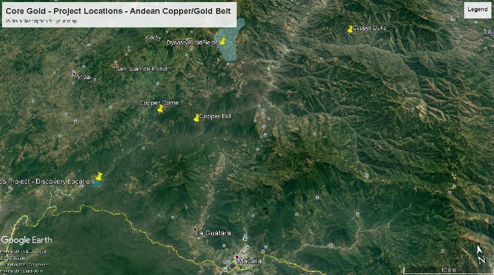 General location of Core Gold Projects in the Dynasty Gold-Copper Belt in Southern Ecuador