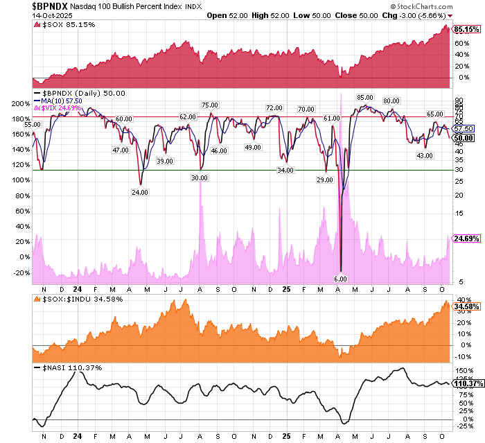 After the market closes updated data on the NASDAQ 100 and Point and Figure Data for the NDX. Also Point and Figure Data on the 30 SOX Components. An explanation of PnF Charting can be found here:
