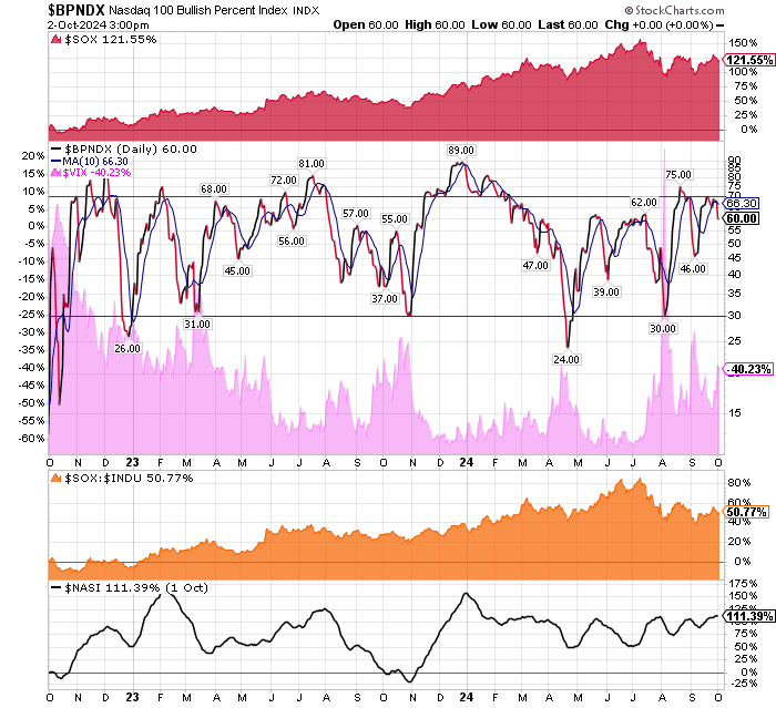 After the market closes updated data on the NASDAQ 100 and Point and Figure Data for the NDX. Also Point and Figure Data on the 30 SOX Components. An explanation of PnF Charting can be found here: