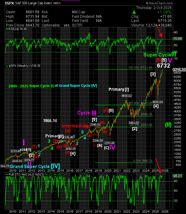 The S&P 500 indicates that we are very late in Super Cycle (I) of Grand Super Cycle [V]. Once Super Cycle (I) is complete, we will have a market correction of more than 50%. Hope for the country and the economy has spurred optimism, resulting in market strength that has pushed the top of SC (I) to ever newer heights. The expectation now is for it to continue to at least the 6700 area. 9/11/2025