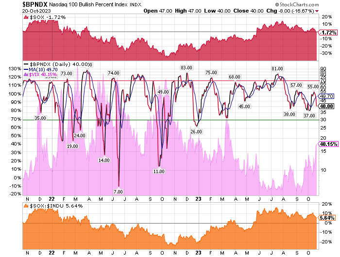 In a normal Bull Market once the BPNDX exceeds 70% buy signals the NDX is overbought. A fall to below 30% buy signals normally represents a chance to accumulate stocks. Of course new bull markets often lead to more than 70% buy signals. Bear markets can give PnF buy signal numbers in the single digits. As of October 19, it appears that stocks associated with the SOX have to not only beat but raise by a lot to rise. The Fed really wants to put a hurt on the market by inducing a recession. Not a rolling recession but a real recession and that mean the market will suffer even more in my humble opinion.