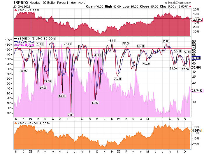 In a normal Bull Market once the BPNDX exceeds 70% buy signals the NDX is overbought. A fall to below 30% buy signals normally represents a chance to accumulate stocks. Of course new bull markets often lead to more than 70% buy signals. Bear markets can give PnF buy signal numbers in the single digits. As of October 19, it appears that stocks associated with the SOX have to not only beat but raise by a lot to rise. The Fed really wants to put a hurt on the market by inducing a recession. Not a rolling recession but a real recession and that mean the market will suffer even more in my humble opinion.