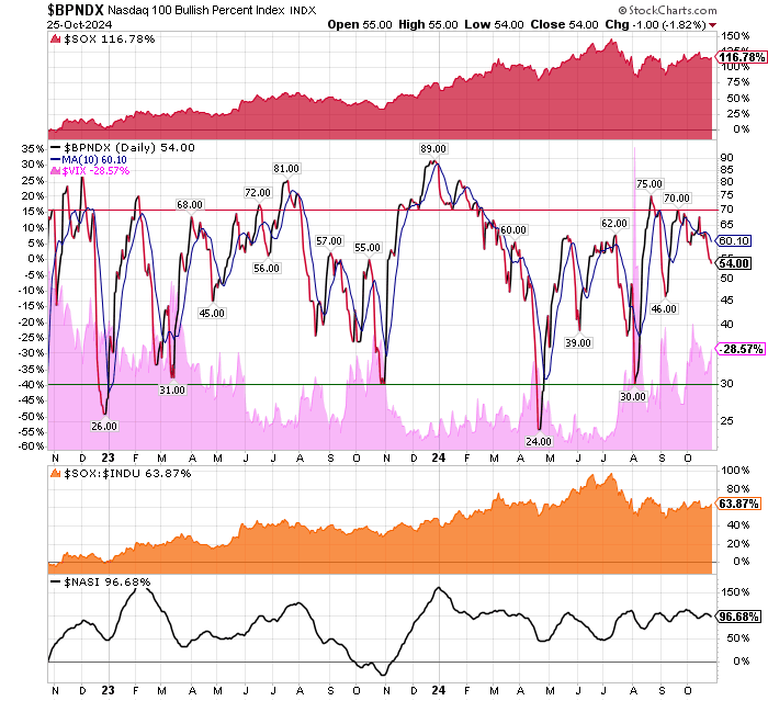 After the market closes updated data on the NASDAQ 100 and Point and Figure Data for the NDX. Also Point and Figure Data on the 30 SOX Components. An explanation of PnF Charting can be found here: