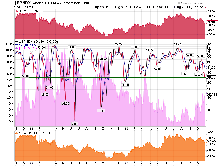 In a normal Bull Market once the BPNDX exceeds 70% buy signals the NDX is overbought. A fall to below 30% buy signals normally represents a chance to accumulate stocks. Of course new bull markets often lead to more than 70% buy signals. Bear markets can give PnF buy signal numbers in the single digits. As of October 19, it appears that stocks associated with the SOX have to not only beat but raise by a lot to rise. The Fed really wants to put a hurt on the market by inducing a recession. Not a rolling recession but a real recession and that mean the market will suffer even more in my humble opinion.