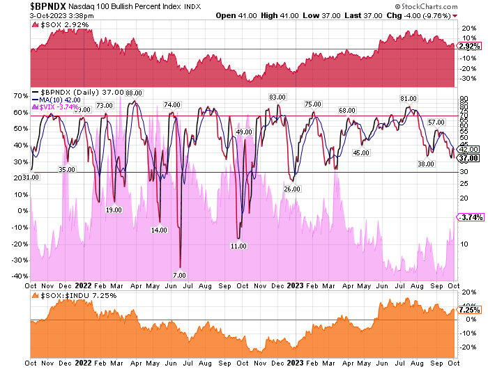 In a normal Bull Market once the BPNDX exceeds 70% buy signals the NDX is overbought. A fall to below 30% buy signals normally represents a chance to accumulate stocks. Of course new bull markets often lead to more than 70% buy signals. Bear markets can give PnF buy signal numbers in the single digits. I bought SOX related stocks on September 27, 2023. Expecting a rally now. My charts below: