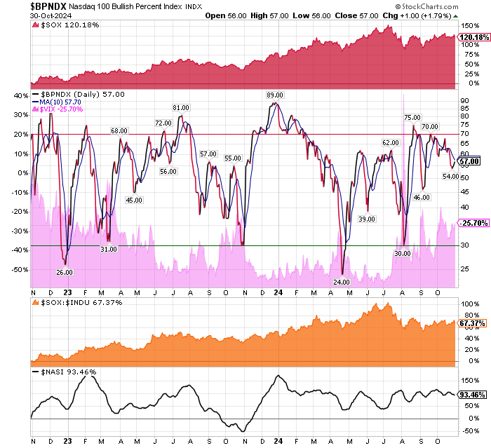 After the market closes updated data on the NASDAQ 100 and Point and Figure Data for the NDX. Also Point and Figure Data on the 30 SOX Components. An explanation of PnF Charting can be found here: