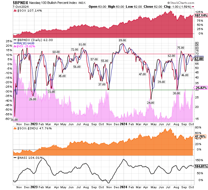 After the market closes updated data on the NASDAQ 100 and Point and Figure Data for the NDX. Also Point and Figure Data on the 30 SOX Components. An explanation of PnF Charting can be found here: