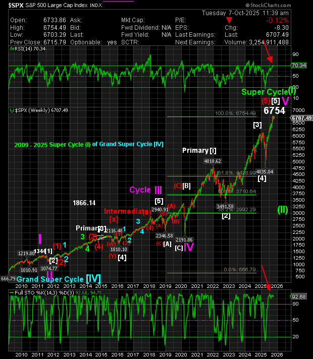 Emphasis will be on short-term to long-term Index trends. The S&P 500 indicates that we are very late in Super Cycle (I) of Grand Super Cycle [V]. Once Super Cycle (I) is complete, we will have a market correction of more than 50%. Hope for the country and the economy has spurred optimism, resulting in market strength that has pushed the top of SC (I) to ever newer heights. The expectation now is for it to continue to at least the 6700 area. 9/11/2025