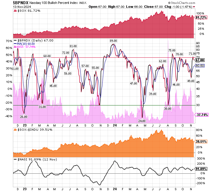 After the market closes updated data on the NASDAQ 100 and Point and Figure Data for the NDX. Also Point and Figure Data on the 30 SOX Components. An explanation of PnF Charting can be found here: