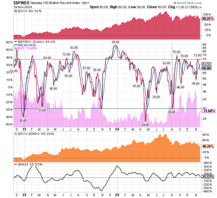 After the market closes updated data on the NASDAQ 100 and Point and Figure Data for the NDX. Also Point and Figure Data on the 30 SOX Components. An explanation of PnF Charting can be found here: