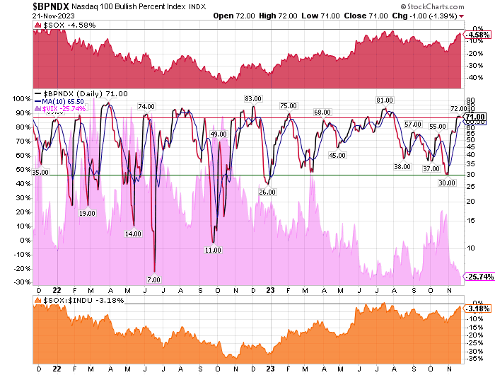 In a normal Bull Market once the BPNDX exceeds 70% buy signals the NDX is overbought. A fall to below 30% buy signals normally represents a chance to accumulate stocks. Of course new bull markets often lead to more than 70% buy signals. Bear markets can give PnF buy signal numbers in the single digits. As of October 19, it appears that stocks associated with the SOX have to not only beat but raise by a lot to rise. On Friday October 27 the BPSOX was an oversold PnF reading of 2 out of 30. BPNDX was 30. The market is in rally mode now 6 days later: