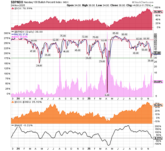 After the market closes updated data on the NASDAQ 100 and Point and Figure Data for the NDX. Also Point and Figure Data on the 30 SOX Components. An explanation of PnF Charting can be found here: