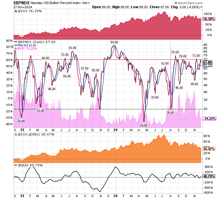After the market closes updated data on the NASDAQ 100 and Point and Figure Data for the NDX. Also Point and Figure Data on the 30 SOX Components. An explanation of PnF Charting can be found here: