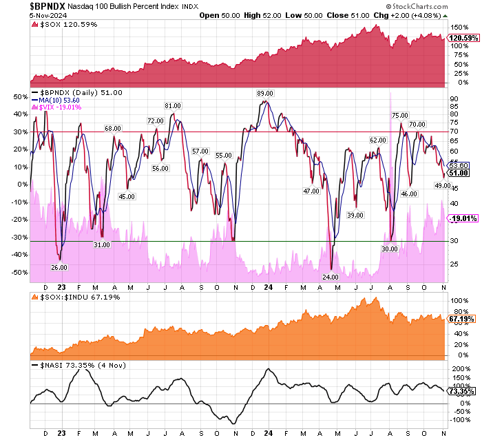 After the market closes updated data on the NASDAQ 100 and Point and Figure Data for the NDX. Also Point and Figure Data on the 30 SOX Components. An explanation of PnF Charting can be found here: