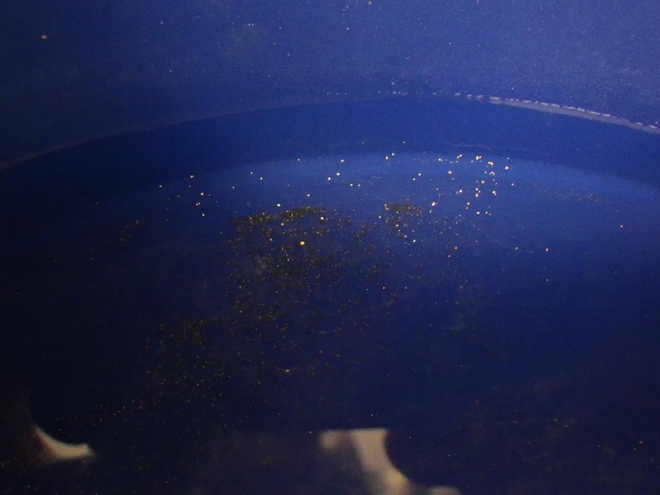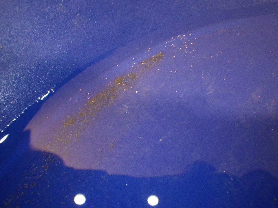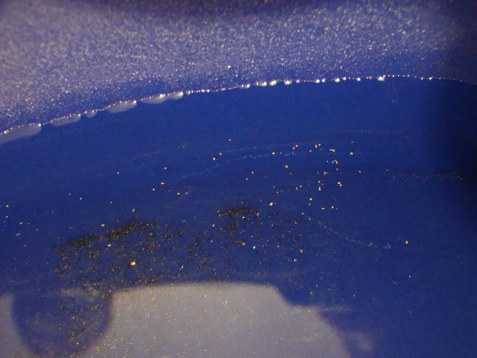 Properally panned there are many fragments of -20, -30, and then into -70 and you can see in the "black sands" hundreds of -150/-250 in the second picture. This would of been from an area the drill had already drilled in part of the main zone.