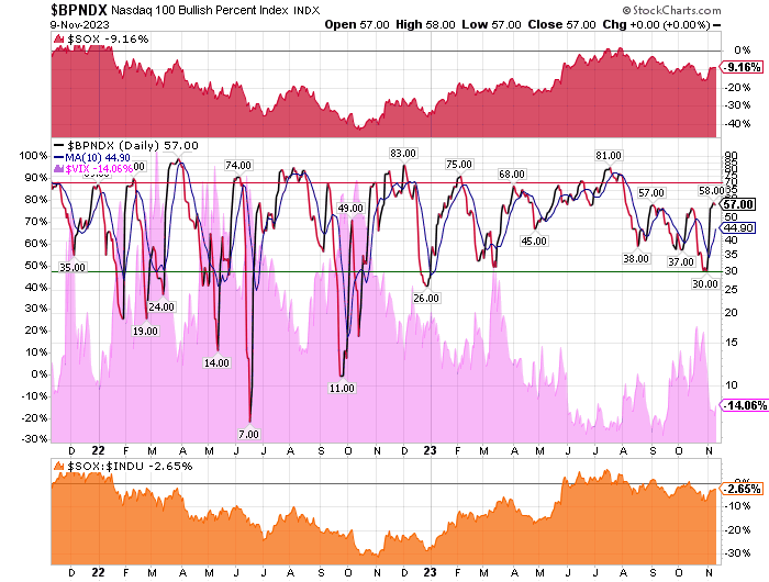 After the market closes updated data on the NASDAQ 100 and Point and Figure Data for the NDX. Also Point and Figure Data on the 30 SOX Components. An explanation of PnF Charting can be found here: