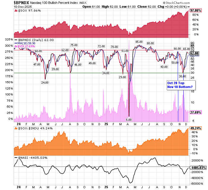 After the market closes updated data on the NASDAQ 100 and Point and Figure Data for the NDX. Also Point and Figure Data on the 30 SOX Components. An explanation of PnF Charting can be found here: