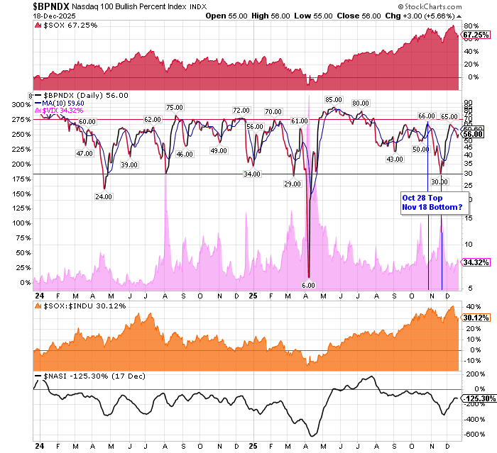 After the market closes updated data on the NASDAQ 100 and Point and Figure Data for the NDX. Also Point and Figure Data on the 30 SOX Components. An explanation of PnF Charting can be found here: