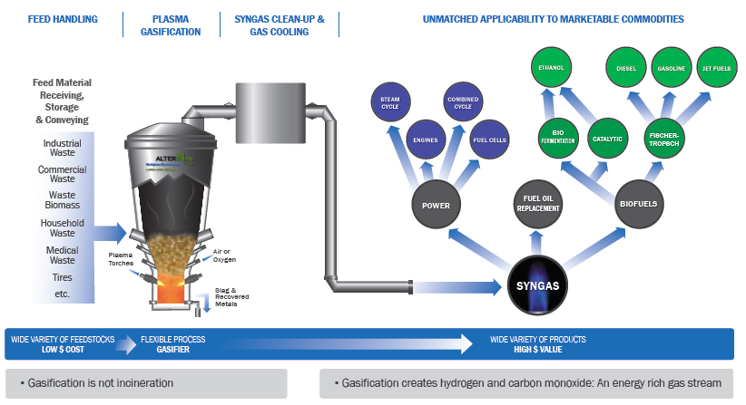 Alter NRG sells plasma gasification solutions that convert waste-to-energy (WTE), generating synthetic fuels from municipal waste, biomass or other feedstocks. Gasification is a process that uses extremely high temperature plasma torches but it is not incineration. The technology was developed over the last few decades by Westinghouse Plasma Corporation. That business unit was spun out and then later acquired in its entirety by Alter NRG. In December 2011 the company announced that it had signed a deal with Air Products for a $22MM gasifier to be located in Tees Valley in the UK. This is the first of five that Air Products intends to build and is representative of the type of larger deal that Alter NRG is currently pursuing. In the Fall of 2013, Air Products announced a final decision to proceed with a second plant of the same scale to be built adjacent to TV-1. Highlights Resources Company web site YouTube videos Raymond James research reports Quote for OTC listing (ANRGF) DOE page on Alter NRG/Westinghouse Plasma Wikipedia page on plasma gasification commercialization