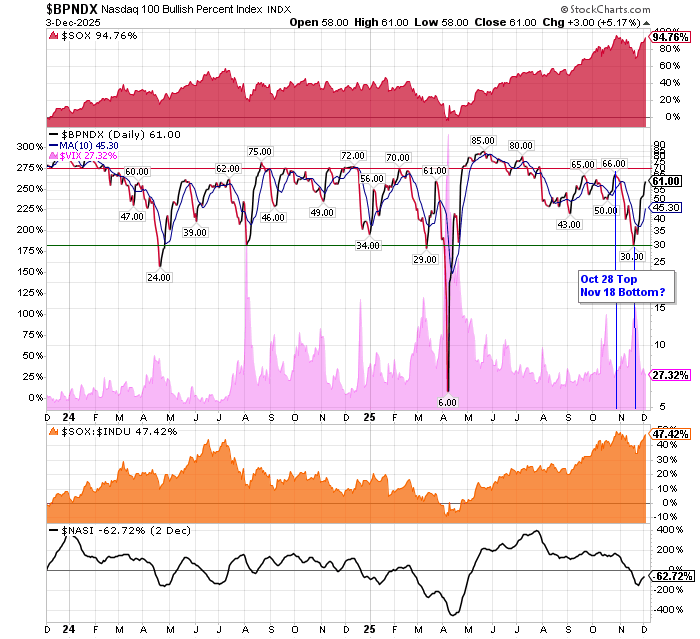 After the market closes updated data on the NASDAQ 100 and Point and Figure Data for the NDX. Also Point and Figure Data on the 30 SOX Components. An explanation of PnF Charting can be found here: