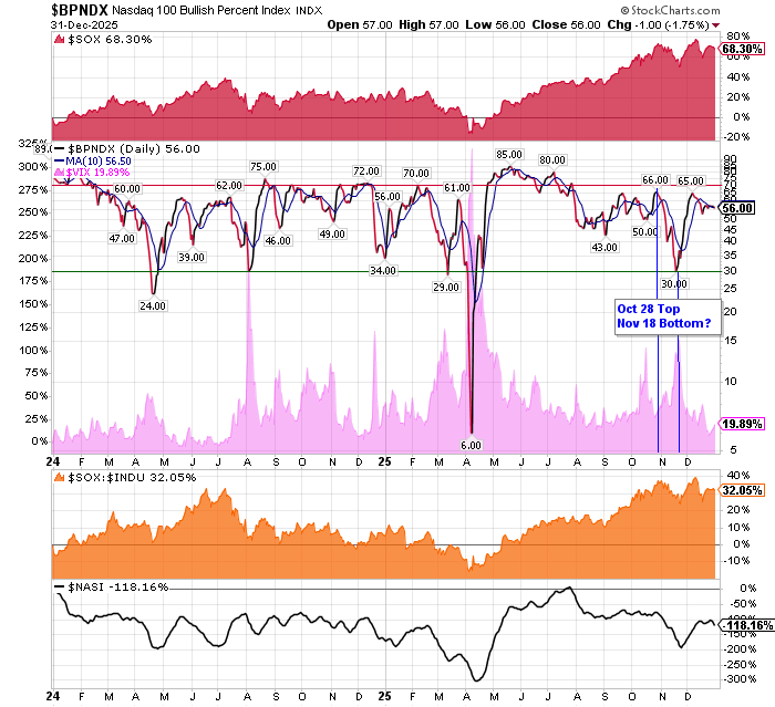 After the market closes updated data on the NASDAQ 100 and Point and Figure Data for the NDX. Also Point and Figure Data on the 30 SOX Components. An explanation of PnF Charting can be found here:
