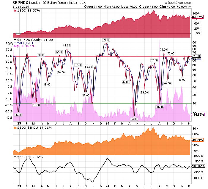 After the market closes updated data on the NASDAQ 100 and Point and Figure Data for the NDX. Also Point and Figure Data on the 30 SOX Components. An explanation of PnF Charting can be found here: