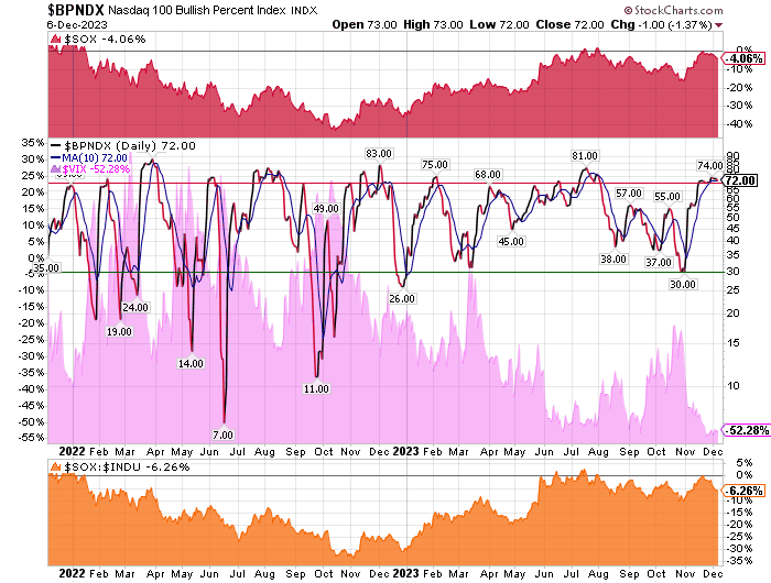 November 24, 2023 the BPNDX has fallen from a recent high of 72 PnF Buy Signals to 70. BPSOX is 27 after NVDA lost its buy signal. Based on my trading parameters I believe some profit taking is in order. The market is overbought and any additional upside as opposed to selling would be very surprising.