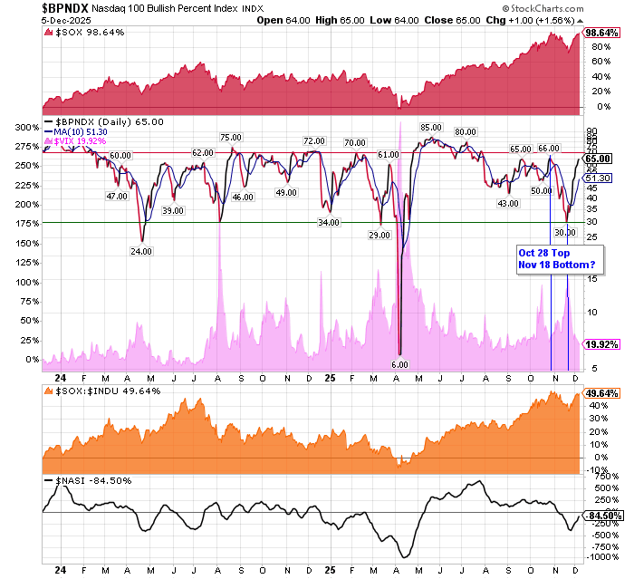 After the market closes updated data on the NASDAQ 100 and Point and Figure Data for the NDX. Also Point and Figure Data on the 30 SOX Components. An explanation of PnF Charting can be found here: