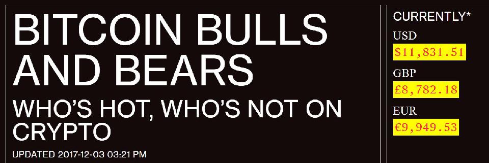 Bloomberg technology --BITCOIN BULLS AND BEARS WHO’S HOT, WHO’S NOT ON CRYPTO UPDATED 2017-12-03 03:08 PM