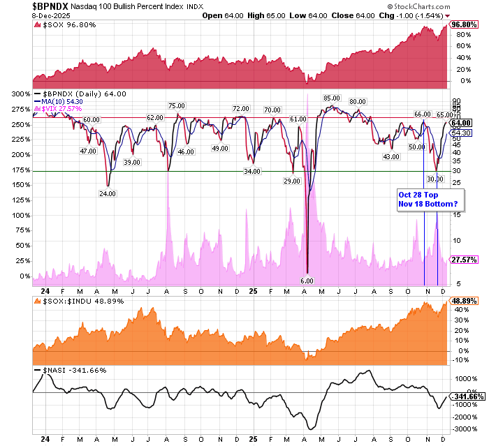 After the market closes updated data on the NASDAQ 100 and Point and Figure Data for the NDX. Also Point and Figure Data on the 30 SOX Components. An explanation of PnF Charting can be found here: