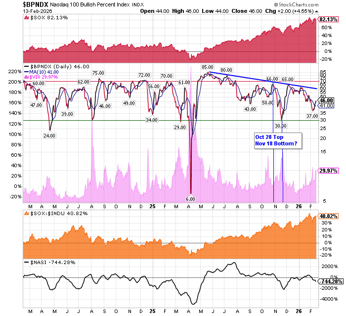 After the market closes updated data on the NASDAQ 100 and Point and Figure Data for the NDX. Also Point and Figure Data on the 30 SOX Components. An explanation of PnF Charting can be found here: