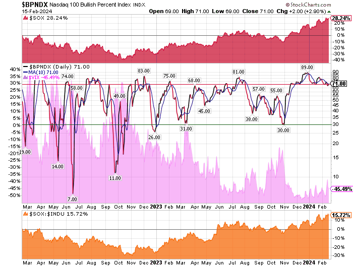 After the market closes updated data on the NASDAQ 100 and Point and Figure Data for the NDX. Also Point and Figure Data on the 30 SOX Components. An explanation of PnF Charting can be found here: