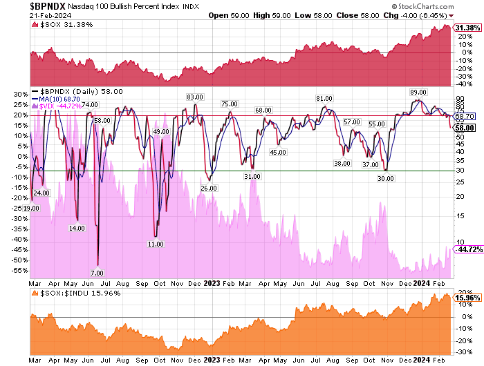 After the market closes updated data on the NASDAQ 100 and Point and Figure Data for the NDX. Also Point and Figure Data on the 30 SOX Components. An explanation of PnF Charting can be found here: