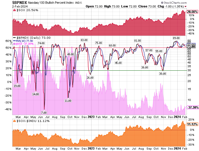 After the market closes updated data on the NASDAQ 100 and Point and Figure Data for the NDX. Also Point and Figure Data on the 30 SOX Components. An explanation of PnF Charting can be found here: