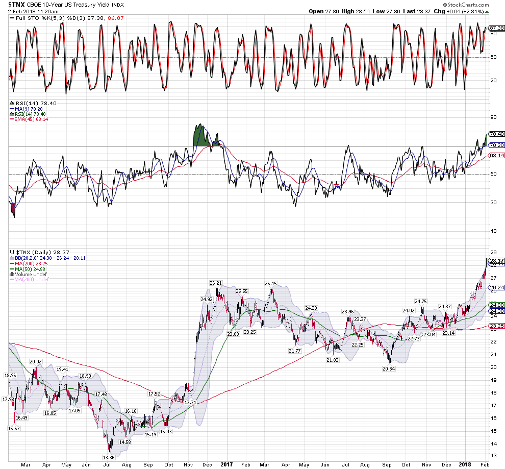 this chart does not reflect the move higher to 2.46% today..... the Yield has not been this far outside of the Bollinger band in years as the bond market moves with lightening speed upward since the low at 2.00 on Friday October 8th 2017.