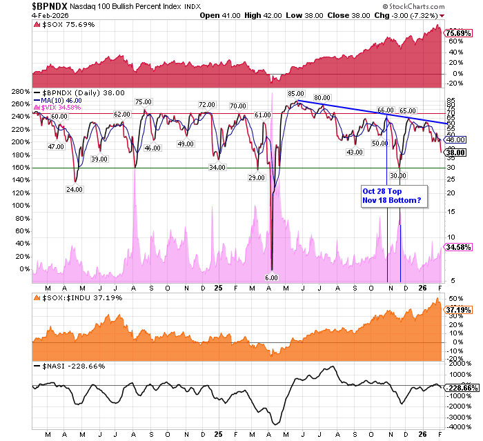 After the market closes updated data on the NASDAQ 100 and Point and Figure Data for the NDX. Also Point and Figure Data on the 30 SOX Components. An explanation of PnF Charting can be found here: