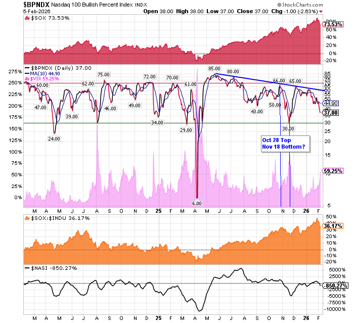 After the market closes updated data on the NASDAQ 100 and Point and Figure Data for the NDX. Also Point and Figure Data on the 30 SOX Components. An explanation of PnF Charting can be found here:
