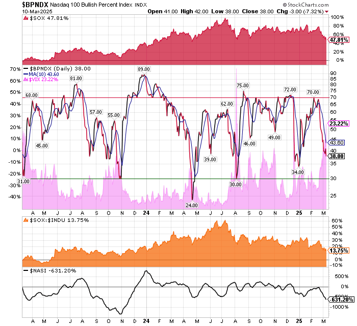 After the market closes updated data on the NASDAQ 100 and Point and Figure Data for the NDX. Also Point and Figure Data on the 30 SOX Components. An explanation of PnF Charting can be found here: