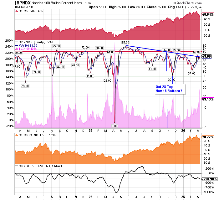 After the market closes updated data on the NASDAQ 100 and Point and Figure Data for the NDX. Also Point and Figure Data on the 30 SOX Components. An explanation of PnF Charting can be found here: