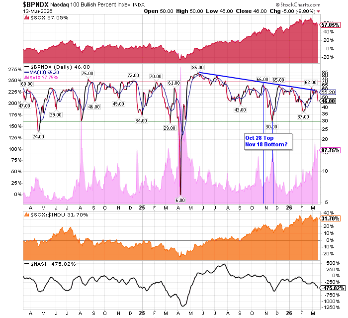 After the market closes updated data on the NASDAQ 100 and Point and Figure Data for the NDX. Also Point and Figure Data on the 30 SOX Components. An explanation of PnF Charting can be found here: