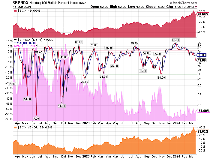 After the market closes updated data on the NASDAQ 100 and Point and Figure Data for the NDX. Also Point and Figure Data on the 30 SOX Components. An explanation of PnF Charting can be found here: