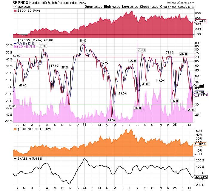 After the market closes updated data on the NASDAQ 100 and Point and Figure Data for the NDX. Also Point and Figure Data on the 30 SOX Components. An explanation of PnF Charting can be found here: