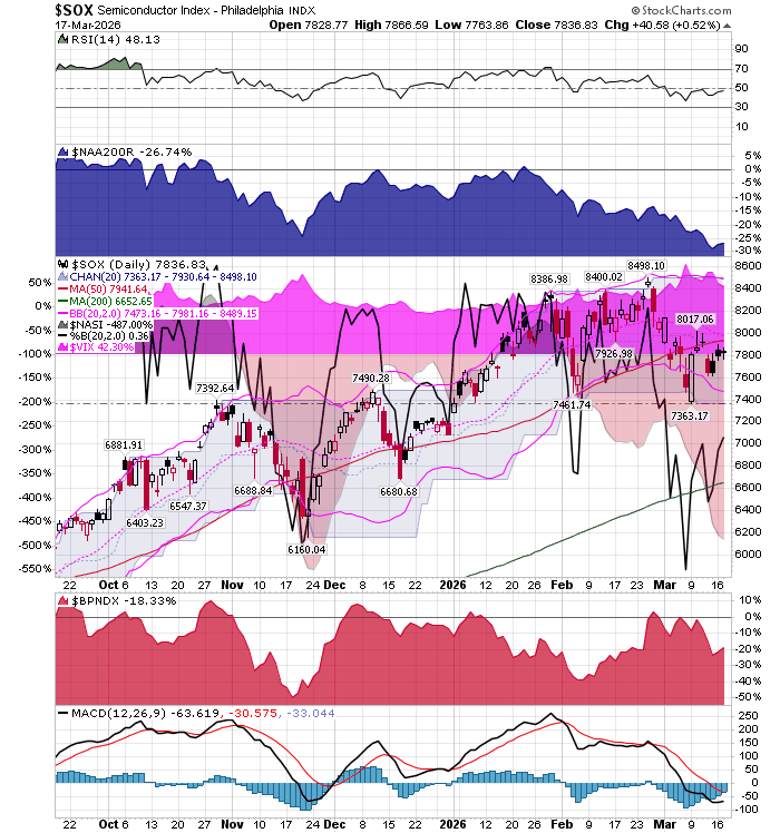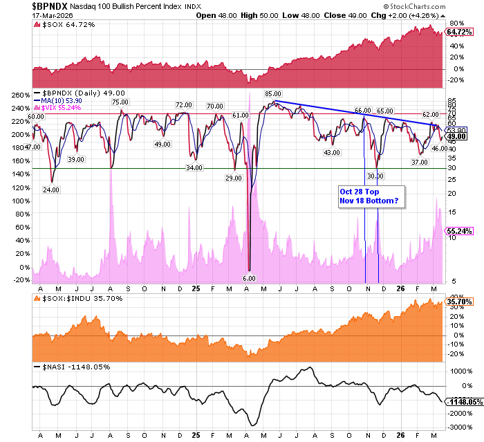 After the market closes updated data on the NASDAQ 100 and Point and Figure Data for the NDX. Also Point and Figure Data on the 30 SOX Components. An explanation of PnF Charting can be found here:
