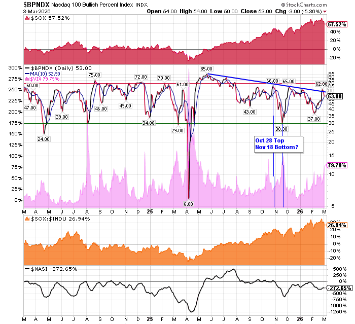 After the market closes updated data on the NASDAQ 100 and Point and Figure Data for the NDX. Also Point and Figure Data on the 30 SOX Components. An explanation of PnF Charting can be found here: