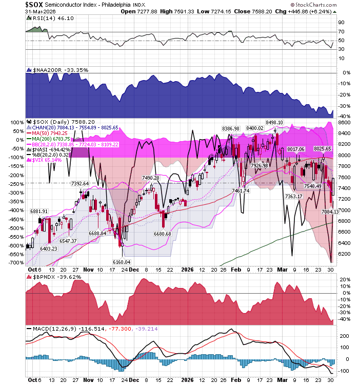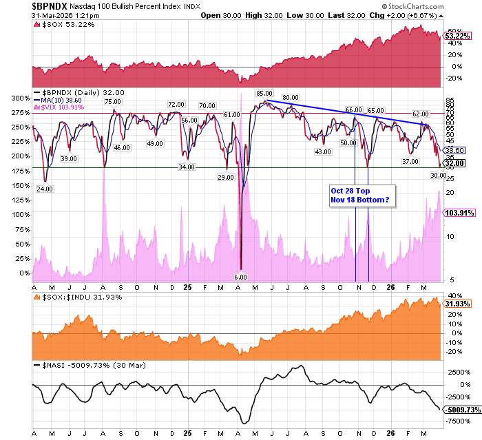 After the market closes updated data on the NASDAQ 100 and Point and Figure Data for the NDX. Also Point and Figure Data on the 30 SOX Components. An explanation of PnF Charting can be found here: