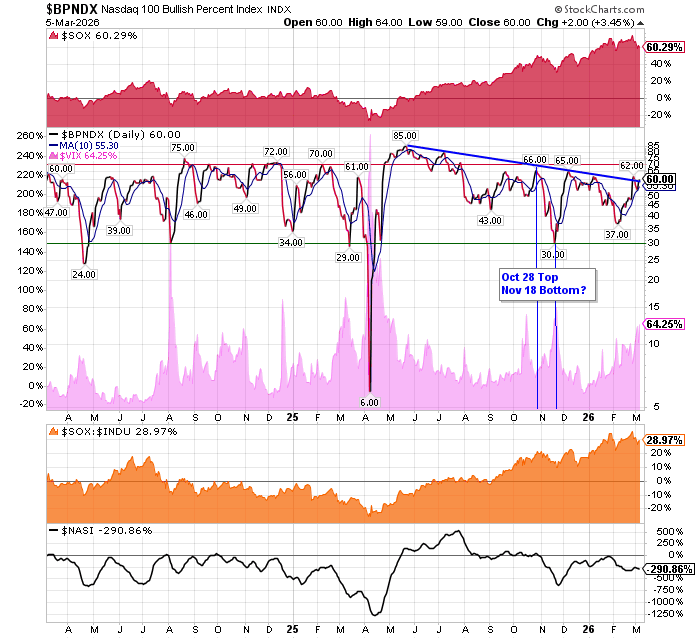After the market closes updated data on the NASDAQ 100 and Point and Figure Data for the NDX. Also Point and Figure Data on the 30 SOX Components. An explanation of PnF Charting can be found here: