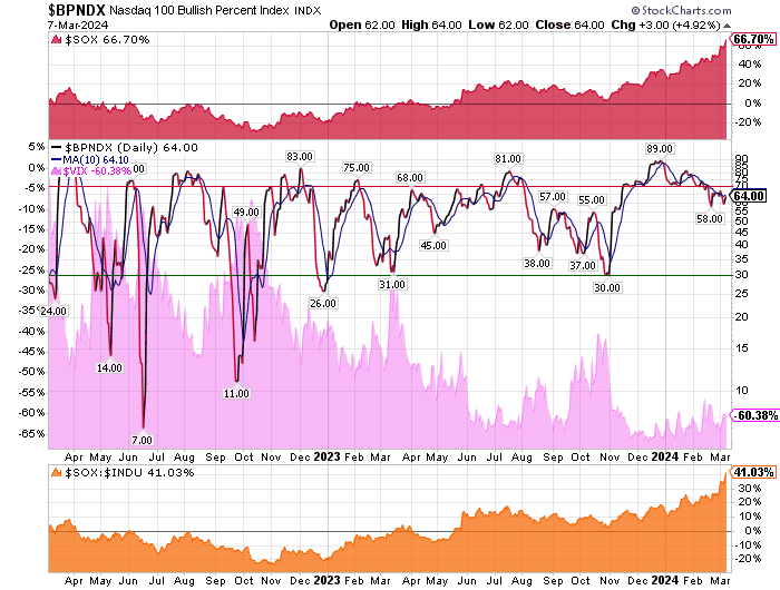 After the market closes updated data on the NASDAQ 100 and Point and Figure Data for the NDX. Also Point and Figure Data on the 30 SOX Components. An explanation of PnF Charting can be found here:
