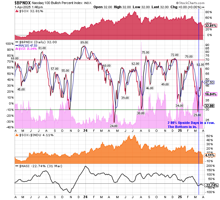 After the market closes updated data on the NASDAQ 100 and Point and Figure Data for the NDX. Also Point and Figure Data on the 30 SOX Components. An explanation of PnF Charting can be found here: